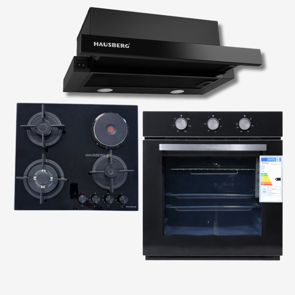 გერმანული ბრენდი „HAUSBERG” გთავაზობთ ჩასაშენებელ სამეულს 1250 ლარად.ზედაპირს აქვს ცეცხლგამძლე, კერამიკული მინა, იგი მარტივად სუფთავდება არ საჭიროებს დიდ ძალისხმევას.ზედაპირი არის 3-1ში,რაც იმას გულისხმობს, რომ აქვს ერთი ელექტრო ქურა. ზედაპირს აქვს გაზკონტროლი, რომელიც უსაფრთხოებისთვის არის შექმნილი, გაზს იცავს გაჟონვისგან,მოსახერხებელია სადილის მომზადების დროსაც, რადგან სადილის გადმოსვლის შემთხვევაში, გაზს ავტომატურად თიშავს. ზედაპირს აქვს ტურბო სისტემა, რომელიც სისწრაფისთვისაა შექმნილი, უფრო ეფექტურად და სწრაფად მოგიმზადებთ საკვებს. ზედაპირს აგერთვე აქვს თუჯის დასადგამი, მეტალის სახელურები, რაც უზრუნველყოფს უსაფრთხოებას,ზედაპირი ინთება ავტომატური ანთებით ღილაკიდან. ღუმელი არის მაღალი ხარისხის, წარმოდგენილია დახვეწილ დიზაინსა და ფერში. მისი შიდა ნაწილი კერამიკული ემალით არის დაფარული, რაც უზრუნველყოფს სისუფთავეს, ცხობის დროს, არ იკრავს ცხიმს, არ იტოვებს სუნს, აქვს 6 ცხობის ფუნქცია (ქვედა და ზედა წვა ცალ-ცალკე და ერთად, ვენტილაცია, გალღობის ფუქნცია და თვითწმენდა), მაქსიმალური გრადუსი აქვს 310. მოყვება ორი საცხობი ფორმა და ერთი ბადე.გამწოვი წარმოდგენილია დახვეწილ დიზაინსა და ფერში, აქვს შუშის პანელი, რომელიც მარტივად სუფთავდება, გამწოვის სიმძლავრე 1500 w, იგი ეფექტურად და სწრაფად იწოვს ცხიმსა და ორთქლს.ზომები: გამწოვი (60/30 ზე, შიდა სიღრმე 16, პანელის ზომა 4), ღუმელი (60/60 ზე, შიდა ლიტრაჟობა 78), ზედაპირი (60/50 ზე). სამეულს მოყვება ოფიციალურად 3 წლიანი გარანტია.